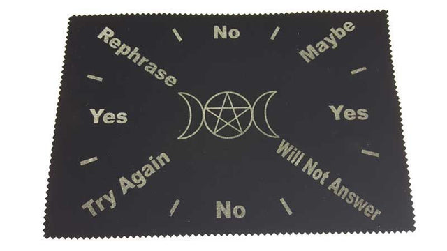 This versatile mat features the powerful Triple Moon symbol intertwined with a prominent pentagram, creating a sacred space for your spiritual practices. Designed with a pendulum map overlay, it provides clear "Yes," "No," and "Maybe" sections, along with directional indicators, to aid in divination and decision-making.